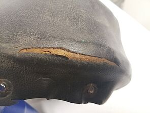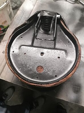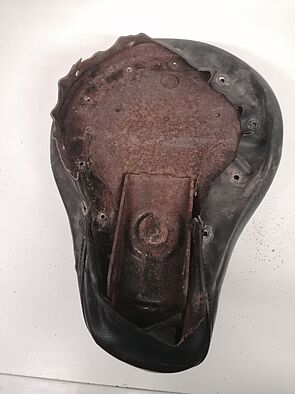 Der Sattel war auch in keinem guten Zustand. Die Decke war an manchen Stellen eingerissen und die Sattelunterseite stark verrostet. Wir haben die Nieten entfernt und die Decke abgenommen. Die Blechteile entrosteten wir mit Mühe und lackierten alles neu. Die Satteldecke wurde hinterfüttert und gereinigt, nun folgt der Zusammenbau.
