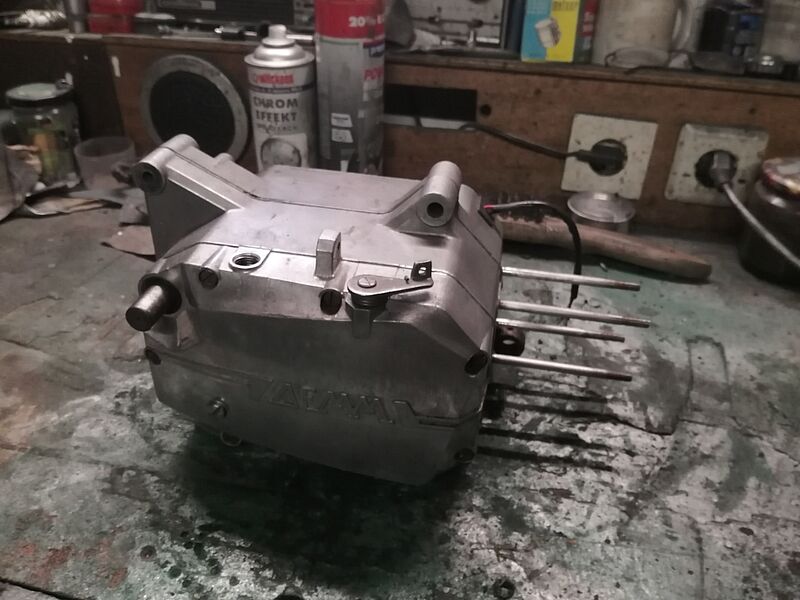 Es hat sich einiges getan. Einer der Motoren aus meinem Fundus haben wir hervorgeholt und frisch gemacht. Der Motor scheint nicht viel gelaufen zu sein, was ich von dem wenig gebrauchten Antriebsritzel ableiten würde. Aus den unsortierten Zylindern, Köpfen und Kolben aus einer Kiste, suchten wir uns die besten Teile für ein Zylinderkit zusammen. Der Motor wurde nur äußerlich gereinigt um ihn später erst mal zu testen, bevor wir ihn evtl. doch öffnen müssen. Den Zylinder entrosteten wir, lackierten ihn mit hitzebeständigen Lack und bauten ihn mit selbst geschnibbelten Dichtungen aus Meterware zusammen.