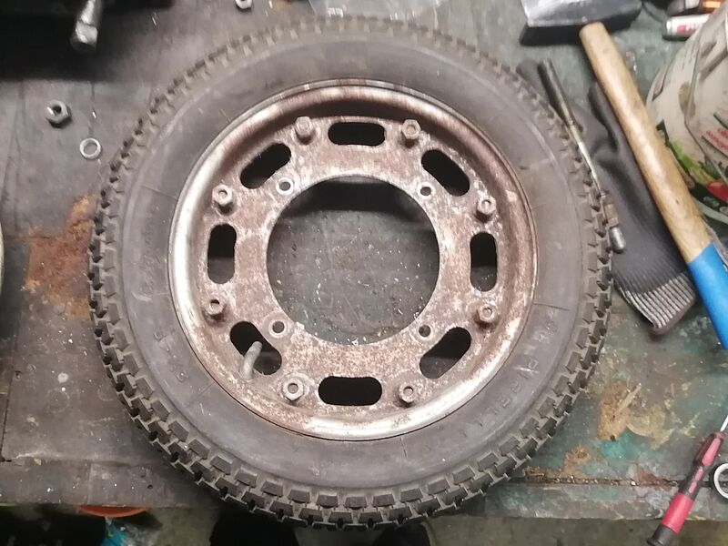 Zwischendurch habe ich die Reifen, bzw. die Felgen schon mal zerlegt, um sie vom Rost zu befreien. Dazu wurden ich sie in ein Bad gelegt und nach einiger Zeit, waren sie rostfrei. Nun werden sie noch lackiert und wieder zusammengebaut. Leider musste ich mir noch einen neuen Schlauch bestellen. Bei dem alten, habe ich leider bei der Demontage im Schraubstock, das Ventil kpl. zusammen gedrückt. Pech