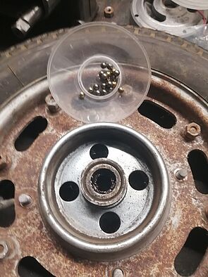 Dann habe ich mir alle Zündungsteile zusammengesucht um daraus wieder einen passenden Satz zusammenstellen. Das sieht nicht ganz so gut aus, dachte ich. Ich fand nur noch ein Schwungrad und das ist auch noch verbogen, weil wohl jemand versucht hat, das Teil gewaltsam zu entfernen. Das konnte ich aber mit einer Nuss und Gegenstücken im Schraubstock, wieder in Form bringen. Ein paar Tage später habe ich aber noch zwei weitere in meinem Fundus gefunden. Die Teile liegen nun auf der Werkbank und müssen nun neu verkabelt werden.